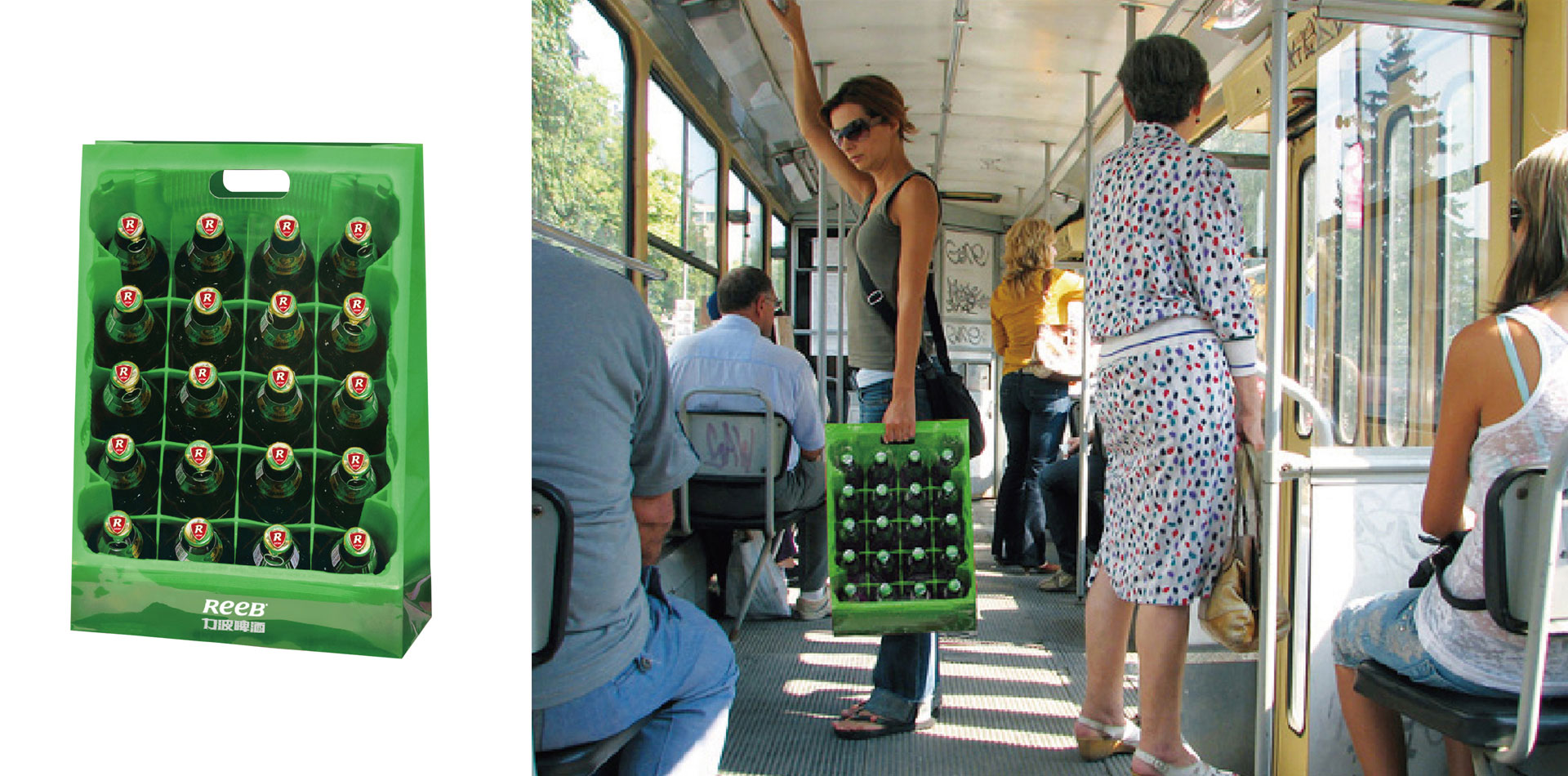 經過設計處理的“REEB”已將近抽象化,對多數消費人群來說品牌可讀性困難,中文“力波啤酒”分別做了兩種字體的處理,同“REEB”的設計產生極大的反差,在同一載體運用過程中,極不協調。關于圖形的問題:使用強烈的紅色,通過菱形及盾牌的結合,創造一種平面的“多邊形”圖形形式,沒有系統的圖形概念延伸,使得圖形孤立、繁復。
