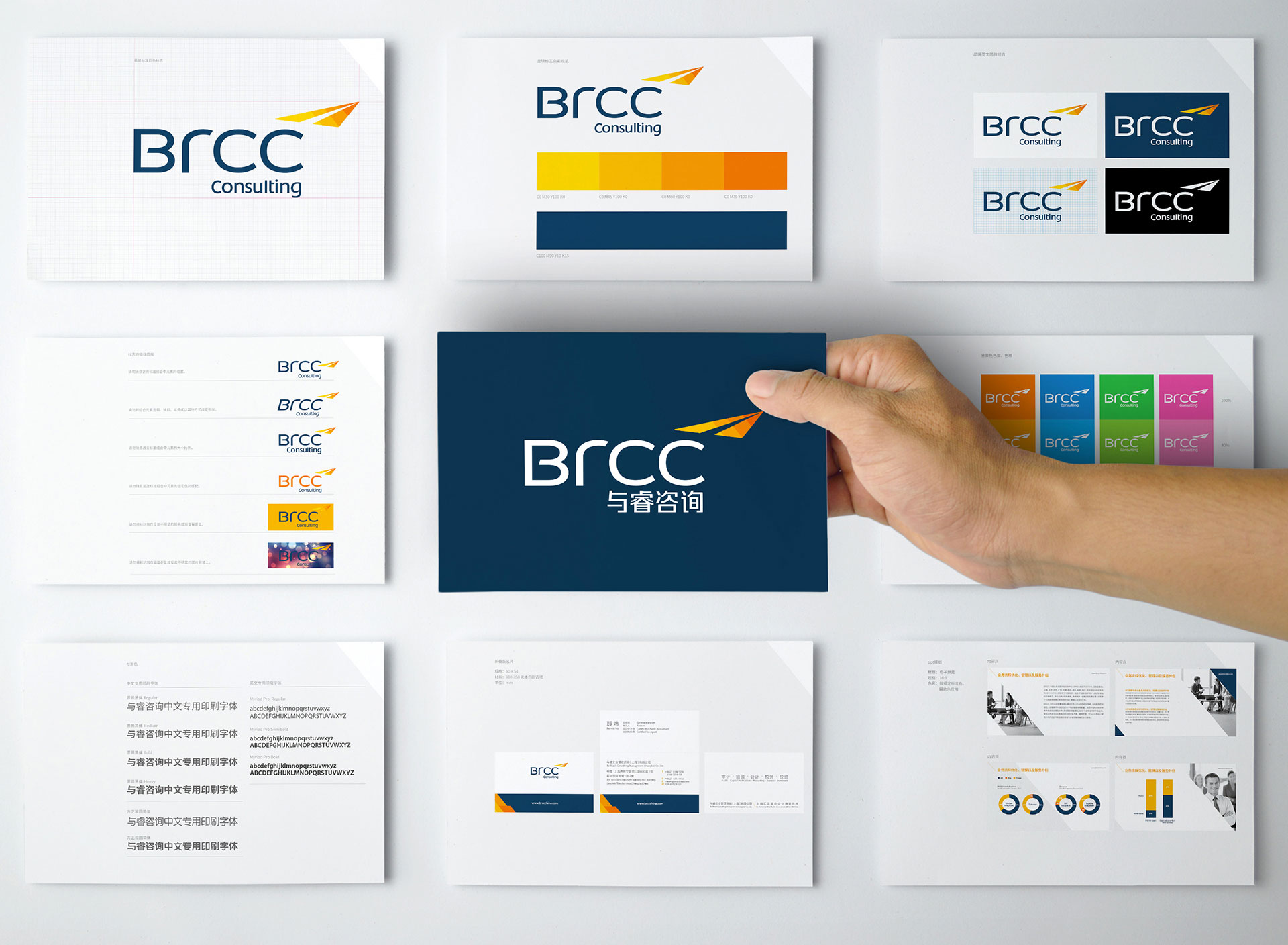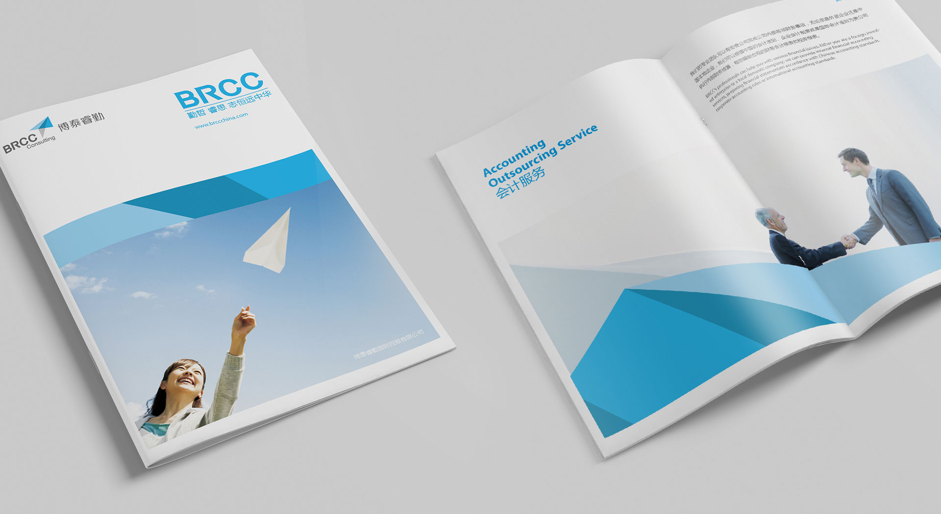 Brcc公司前身是由上海會記事務所,上海與睿企業管理咨詢公司,上海睿問財務管理咨詢,三家業務領域公司合并設立而成。為了體現出三家公司合并屬性,巧妙使用疊加設計手法,形成一部紙飛機。紙飛機對大眾的認知聯想是:一群天真爛漫的孩子,匯集著彩色的夢想,一疊彩色的紙飛機,,載著夢想翱翔在蔚藍的天空。體現公司的品牌理念“勤哲·睿思 — 承載夢想”。